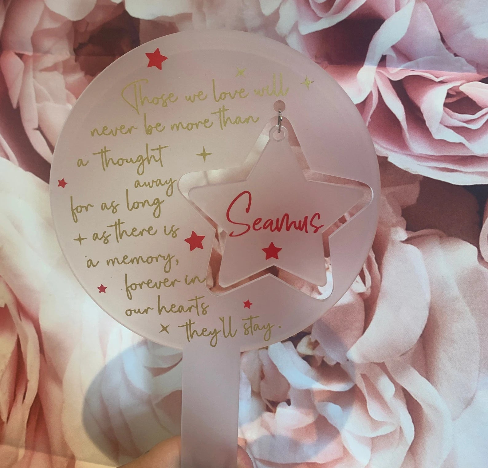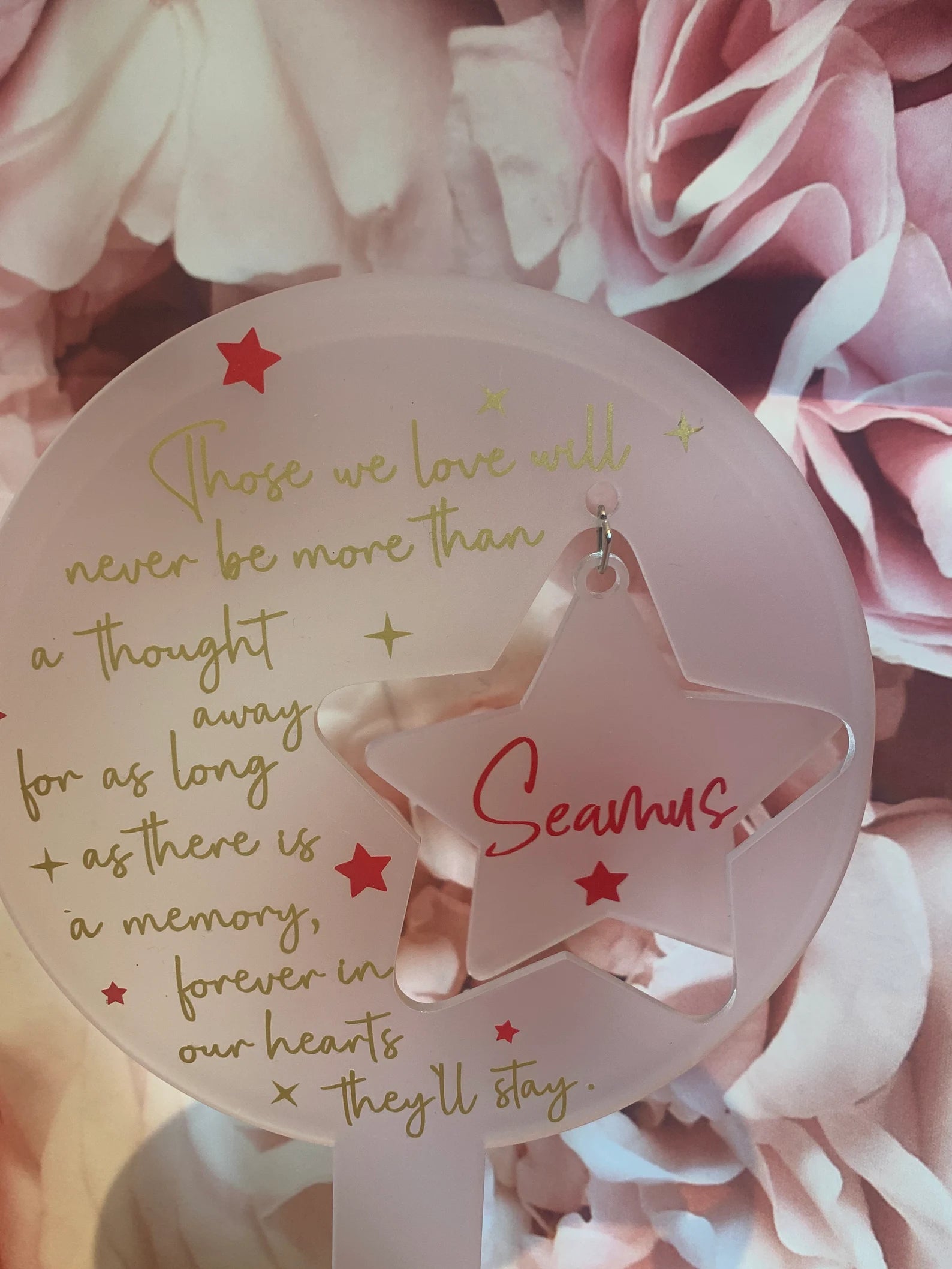 Any specific text you’d like, please add in the PERSONALISATION BOX BELOW if not the text will be the same as in the photo but state if you’d like ‘our’ or ‘my’ and also your loved ones name for the hanging star/heart.