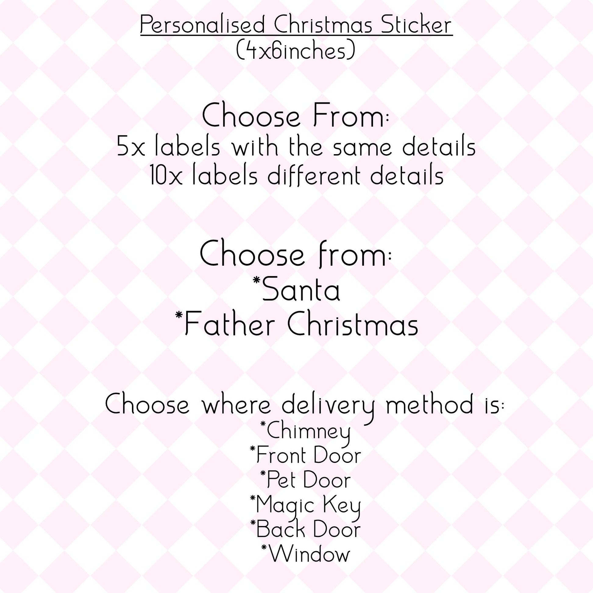 Each label is custom printed with your child’s name and address(if you would like it on the sticker), Santa’s/Father Christmas' official seal, a Nice List tick and the delivery method — making every present feel like it was delivered by Santa himself!